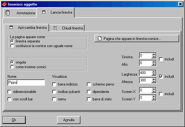 Ad esempio in figura scegliamo di lanciare la finestra separata “Pippo” di 400x300 punti. Avremmo potuto scegliere di sostituire la cornice “BottomFr” per esempio: